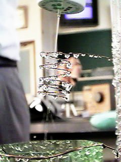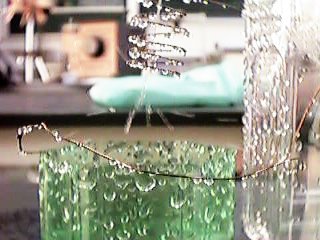 ケルビンの水滴発電器をペットボトルでつくり、静電気モーターを回した。水滴が飛び散るが、良く見ると電気力線の形になっている。作って思うことは、ペットボトルは絶縁が良いこと、エナメルも絶縁が良いこと、ノズルはガラスで作った方が良い。