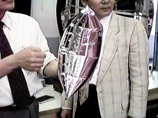 盥(直径 62cm)にアルミ蒸着シート(幅 90cm)を張って本管先生の空気抜きポンプで空気を抜くと大きくてきれいな凹面鏡ができる。太陽を 3mm位に集光することができる。